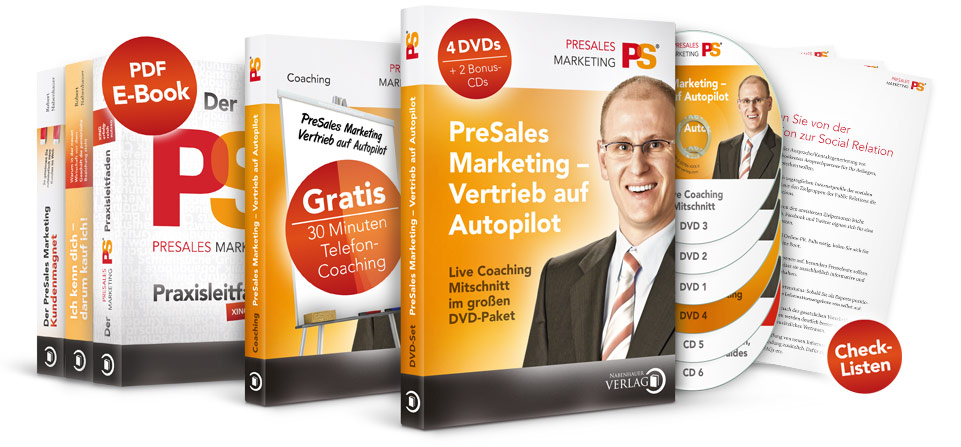 Sie erhalten das DVD-Set für 997,- Euro. Da ist alles drin, was Sie für die Umsetzung vom PreSales Marketing brauchen, inklusive der praktischen Download-Variante für alle Inhalte.